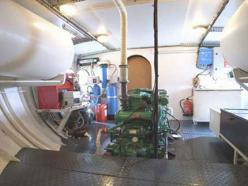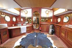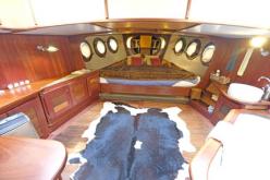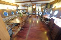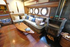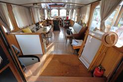 Constructeur : Hollandais , aménageur Français Description : Niveau Pont : L'entrée se fait sur la terrasse milieu qui donne de plein pied dans la superstructure où se trouve une cuisine Américaine équipée en demi-cercle sur l'arrière, un carré avec banquette en L sur tribord et un piano droit sur bâbord. La supertructure construit en ossature et toit acier pour une parfaite étanchéité est entourée à mi-hauteur de bois massif et double vitrages et est réalisée en arrondie sur l'arrière, reprenant la forme arrière du bateau et s'inspire d'architectures typiques des années 30. Cet espace offre une vision à 360° au-dessus de l'eau, assis ou debout et offre beaucoup de luminosité avec une grande claire-voie amovible zénithal permettant également via les trappes planchers de donner un accès à la salle des machines pour des maintenances futures. Dès l'entrée un escalier colimaçon stylisé en acier massif sur tribord distribue le niveau cale pont inférieur. Niveau pont inférieur : Dans les formes avant, une suite parentale pleine largeur avec sa baignoire, ses meubles intégrés, fermée par une cloison et porte centrale acier. Un immense pièce à vivre ouvert avec de nombreux hublots en cuivre massif comprenant 2 espaces salon en face à face pouvant être convertis en couchages supplémentaires, 1 carré avec banquette en L, 1 coin bureau, 1 wc indépendant, puis l'accès sur l'arrière via une petite coursive qui distribue 1 douche indépendante, en face 1 lit cabine puis via une porte étanche centrale accès à l'immense salle des machines qui a été reconditionné à neuf, gratté, peinte en blanc et ou tout le matériel technique neuf de 2006 a été installé. Volume habitable de 110 m² avec une grande hauteur sous-barrots + 25 m² de terrasse, abritée par un taud. A visiter absolument pour voir la qualité de l'aménagement et des matériaux. L'ensemble des meubles en acier et bois massif sont vendus avec le bateau.