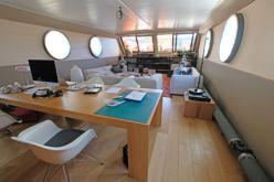 Constructeur : Hollandais Description : Superstructure de 13,50 m X 5 m acier construit par chantier professionnel sous le champ de vision de la marquise. L'entrée se fait par bâbord sur l'arrière de la cale et sert de sas de distribution vers soit la partie ancien logement de marinier réaménagé en luxueux logement soit à desservir la partie cale. Par rapport à une 38 m classique et vu la largeur le logement arrière fait 50 m² et regroupe une cuisine en L, une pièce chambre ou rangement, une salle de bain spacieuse avec douche wc lavabo , une chambre propriétaire et un grand dressing. La partie cale est aménagée en un vaste salon de 45 m² équipé hifi et home cinéma avec une cloison transversal acier séparant une bibliothèque et une cuisine en U. 12 hublots ouvrants cuivre de grand diamètre et une baie vitrée avant coulissante donne beaucoup de luminosité à la pièce. Le sol du salon est surélevé de 1,60 m par rapport au tillac azobé du bateau pour permettre l'accès au fond, aux gaines techniques et au lest amovible. Une pièce avant non aménagée de 30 m² pourra communiquer avec le salon (percement de l'escalier sur l'avant du salon en cours). Un escalier milieu acier sur l'avant du salon distribue une terrasse de 15 m² encastrée dans denbords et couverte d'un taud sur armature acier coulissante permettant d'en faire une terrasse soleil ou abritée. Peintures extérieures en bon état en cours de rénovation. Pic avant local propulseur d'étrave + pic avant logement de mousse de 20 m² + pic avant bail à chaînes. Timonerie bois exo refaite à neuf avec taud en recouvrement. Terrasse sur rouf de 65 m² et terrasse rouf logement arrière. Caracteristiques : Construit en 1963 en Hollande au chantier V/M Geleins à Roodevaart et converti en luxueuse péniche de plaisance à usage privé logement avec une hauteur sous barrots de 2,50 m. Expertise plan de sondage 2012, épaisseurs entre 6,9 mm et 9,2mm, moyenne 7,6 mm (surdimensionnées pour une 38 m). Certificat bateau motorisé en cours de renouvellement. Visible 78 sur stationnement à 640 € par mois. Direction hydraulique + 2 safrans. Hélice 3 pales bronze diamètre 1300 mm Grue hydraulique + bachot L'avis de PENICHES BATEAUX LOGEMENTS : un des rare si ce n'est pas le seul Campinois raccourci à 38 m lui donnant un volume habitable exceptionnel et son esprit loft; à côté une 38 m classique semble bien petite. Un prix justifié au regard de sa valeur nautique au vu des équipements et matériaux installés.