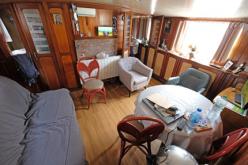 Constructeur : Belge Description : Entrée par une des 2 portes de la marquise. Logement derrière marquise abritant cuisine salle à manger. Logement devant la marquise abritant 2 cabines et salon. Ce logement surplombe sur 2,50 m la cale (permettant de faire un passage facilement de ce logement à la cale) Cale de 24 m de long pleine hauteur + 2,50 m de long au-dessous du logement arrière + 1,50 m de long au-dessous du logement mousse = 28 m de long de cale avec plancher azobé en très bon état, fond huilé Porte étanche sur cloison salle des machines et accès extérieur tribord arrière à la salle des machines Pic Avant baille à chaine et logement mousse 1 cabine + rangements. Taud démontable recouvrant l'ensemble du logement arrière. Fenêtres alu du logement arrière changées. Treuil avant à bain d'huile + 2 ancres de 275 kgs + treuil arrière avec 1 ancre de 175 kgs. Ecoutilles alu. Tabernacle avant abritant le groupe électrogène. Grue milieu bâbord pour grand bachot polyester. Terrasse pontée à hauteur des plats-bords entourée par les denbords de 6 m x 4 m sur ouverture de cale arrière.