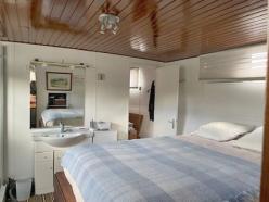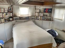 Constructeur : Hollandais Description : L'entrée se fait par une des 2 portes de la timonerie avec sa belle barre à roue et banquette. Vers l'arrière, escalier 7 marches vers chambre avec lit podium 160 et baignoire au ras du sol, wc fermé par porte. Vers l'avant de la timonerie un escalier 4 marches distribue la grande pièce salon salle à manger cuisine Américaine avec bar. Cuisine équipée comme un appartement avec grand frigo congélateur, grand piano 5 feux gaz et four, micro-ondes, lave-vaisselle, évier. Sur l'avant une cheminée bois foyer fermé. Dans cette pièce 4 grandes baies vitrées coulissantes apportent beaucoup de luminosité et le plancher surélevé au niveau de l'eau permet d'avoir à la fois une vue sur l'eau aussi bien assis que debout et permettent l'accès à la zone technique cuves via trappes plancher. Un escalier 6 marches permet du salon d'accéder directement à la terrasse rouf avant. Vers l'avant du salon sur tribord une chambre pleine largeur avec lit 160, douche, évier et Wc séparé fermé par porte. De cette chambre accès sur tribord à une deuxième chambre pleine largeur avec lit 160, douche, évier et Wc séparé par une porte. Un escalier 7 marches sur bâbord permet à la fois une issue de secours, de rendre la chambre indépendante et d'avoir un accès à la terrasse. De cette chambre accès au pic avant. Salle des machines accessible par escalier relevable chambre arrière, moteur, groupe électrogène sous cocon et chaudière chauffage central. La terrasse de 40 m² devant marquise est sur 2 niveaux avec sur la partie avant en contrebas un espace kitchenette avec évier et barbecue. Etat des peintures extérieures en cours de rafraichissement.