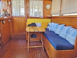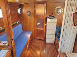 Constructeur : Hollandais Description : Magnifique esthétique de Tjalk à timonerie centrale. Deux entrées par les deux portes de la timonerie centrale, pièce avec banquette, équipets et poste de pilotage. Vers l'arrière, cockpit terrasse abrité par un toit en dur et fermé sur les côtés par 2 tauds (on pourrait fermer définitivement par création de 2 huisseries double vitrage coulissantes), c'est une pièce d'été et de mi-saison qui sépare la chambre arrière via un joli quart colimaçon, la chambre possédant 1 petit bureau, penderie et équipets. Sous le cockpit salle des machines : moteur, groupe et chaudière avec accès facile via 2 grandes trappes isolées thermiques et phoniques. Vers l'avant de la timonerie, 3 marches en contrebas, vaste pièce regroupant bâbord/tribord une cuisine équipée et 1 salon avec 2 lits banquettes. Vers l'avant sur tribord vaste salle de douche avec évier et sur bâbord en face wc indépendant, puis chambre avant invité avec de nombreux équipets. Boiseries et planchers chevillés en Frêne de remarquable qualité, de couleur uniforme sur la totalité de l'aménagement. Isolé laine de roche. Très bon état des peintures et des huisseries extérieures. Caracteristiques : Construit en Hollande par le chantier Balkmeyer en l'an 1896 ce bateau a été aménagé par des professionnels dans les règles de l'art dans les années 2000 et amélioré par ses derniers propriétaires pour en faire un bateau autonome ( cuve à eau de 2000 L, Victron permettant de convertir les 340 Amps de batteries en courant 220V , groupe électrogène, équipements en 24V, chauffage central, etc). Travaux du dernier propriétaire : cuve eaux usées, Victron multiplus , frigo 24 V, chaudière chauffage central. Expertise plan de sondage mars 2017, travaux coque : néant mis à part 8 anodes. La coque a été en majorité doublé en acier soudé. Historique complète des dernières sorties d'eau 2000 et 2008. Certificat de navigation de plaisance pour 12 personnes catégorie C volume 55,2m3. Immatriculation Française. COT sur le 94 à 520 € par mois. Assurance navigation 1.120 €/an. Nombreuses photos sur demande. BAISSE DE PRIX à 220.000 € L'avis de PENICHES BATEAUX LOGEMENTS : Une très belle coque et une super-structure réussie et proportionnée en font un magnifique bateau. Un aménagement de qrande qualité avec de très belles boiseries. Bateau équipé pour naviguer en autonomie. Une taille idéale et raisonnable pour habiter confortablement et naviguer facilement sur tous les canaux avec son tirant d'eau et tirant d'air réduit. Rien à faire. En conclusion : un coup de coeur assuré si vous recherchez toutes ses qualités, à financer comme un appartement.